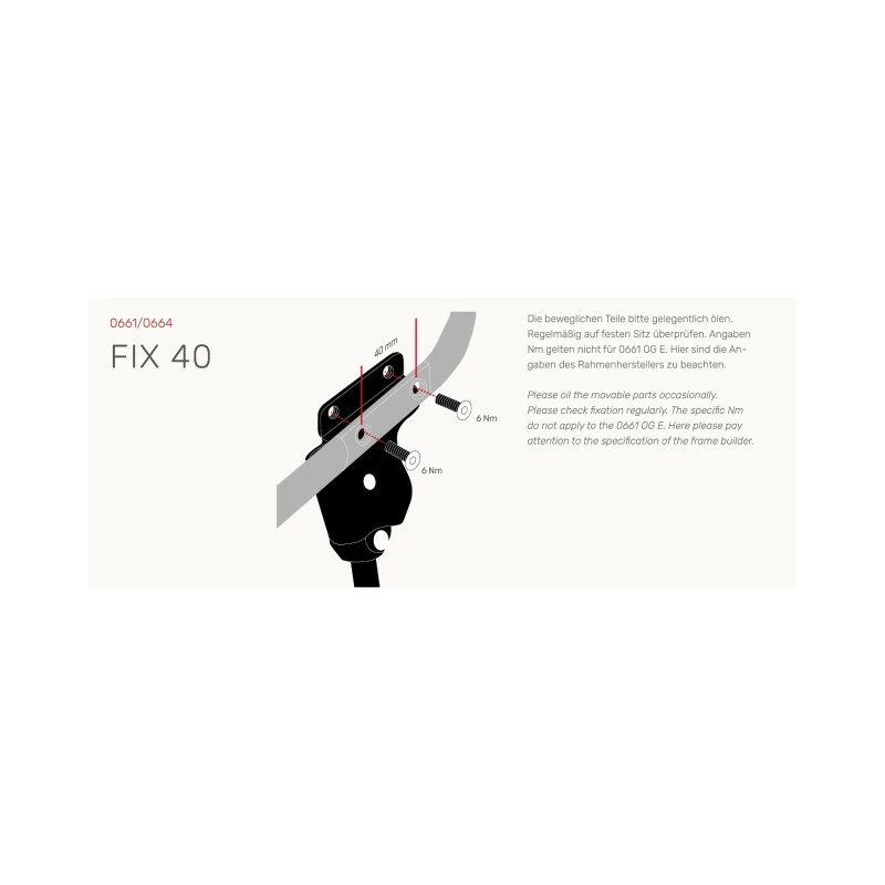 Der FIX 40 T mit verlängerten Kopf bietet aufgrund der tieferliegenden Mechanik einen deutlich grösseren Abstand (ca. 70 mm) zum Achsmittelpunkt des Rades und ermöglicht somit eine ideale Verwendung von Anhängerkupplungen. Durch die spezielle Konstruktion des Ständer-Kopfes wird dem Radler zusätzlich mehr Fussfreiheit geboten.